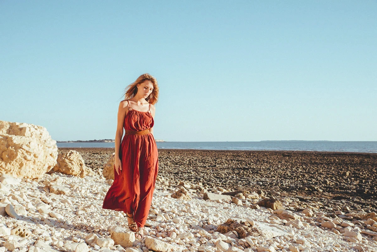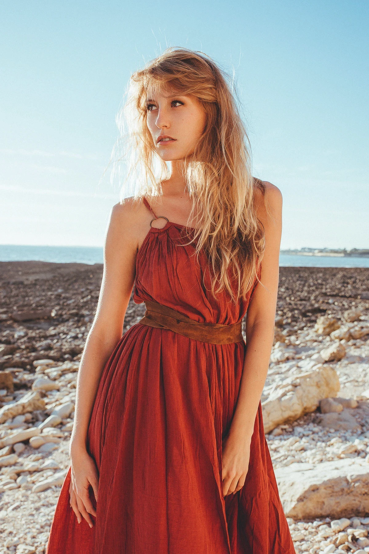 Golden hour, coastal rocks, raw textures.